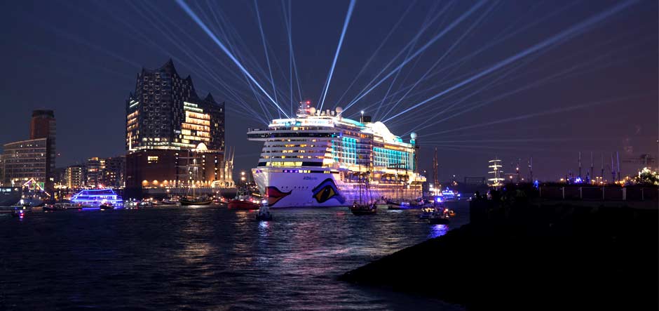 On 6 May, people watched live in Hamburg, on television and via social networks as AIDAprima left her dock at Cruise Center Steinwerder and passed by Hamburg’s waterfront and the Elbphilharmonie before berthing at the Harbor Piers. A crowd sang a birthday serenade as the ship was manoeuvred to her new position. At 10:30pm, AIDAprima hosted a light show and a 15-minute fireworks display, before departing Hamburg for a seven-day Western Europe roundtrip.