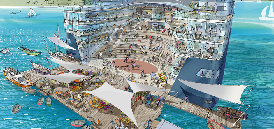 The Cove can change with every port. Just imagine: a Spanish street food fiesta one day, a Moroccan souk the next. At sea, the Cove becomes a tiered town square with Spanish steps overlooking restaurants and a performance space. Balconies look out over the stern, offering passengers a great view and atmosphere. Salt water swimming pools allow passengers to swim safely. Pop up cafes or gelato shops are set up and run by local restaurateurs. Local fishermen come to the ship every morning, allowing passengers to pick their produce and have it grilled on site. Local craftsmen and artists set up stalls to sell their wares, all creating a lively seaside town atmosphere onboard the ship.