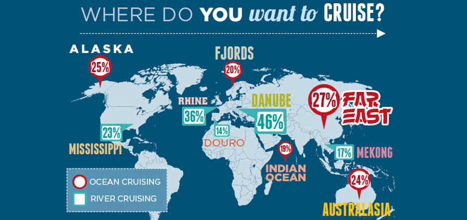 Meanwhile, Europe is set to be the most popular destination for river cruises in 2015-2016. Around 46% of respondents want to cruise on the Danube, while 36% are planning to sail on the Rhine, 23% on the Mississippi in the US, 17% on the Mekong in Southeast Asia and 14% on the Douro in Spain.