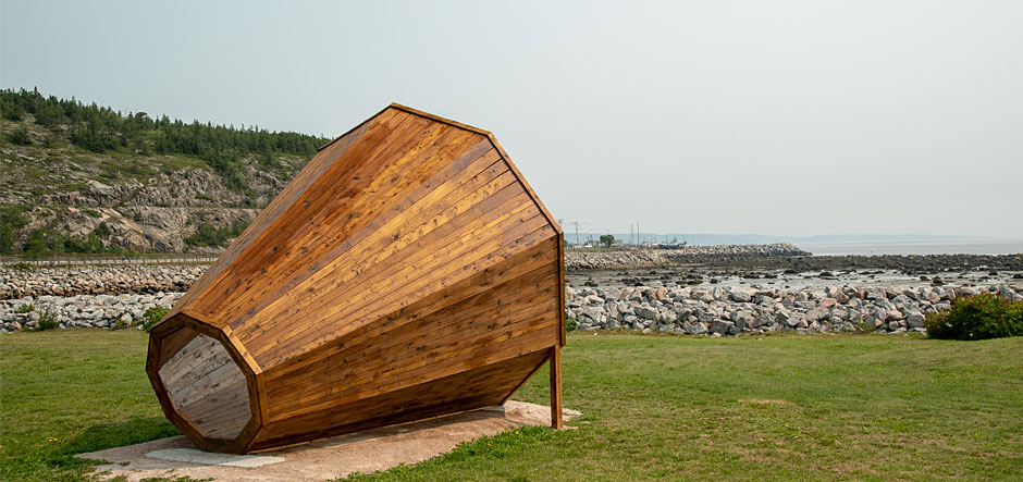 Measuring 12 feet in diameter and 12 feet deep, the three megaphones were built by Julie Tremblay, woodworker and owner of local wooden furniture restoration company Au Passé Recomposé. They were constructed as part of a major project funded by Tourisme Québec, which aims to develop the tourist circuit surrounding the cruise terminal and Parc des Pionniers.
