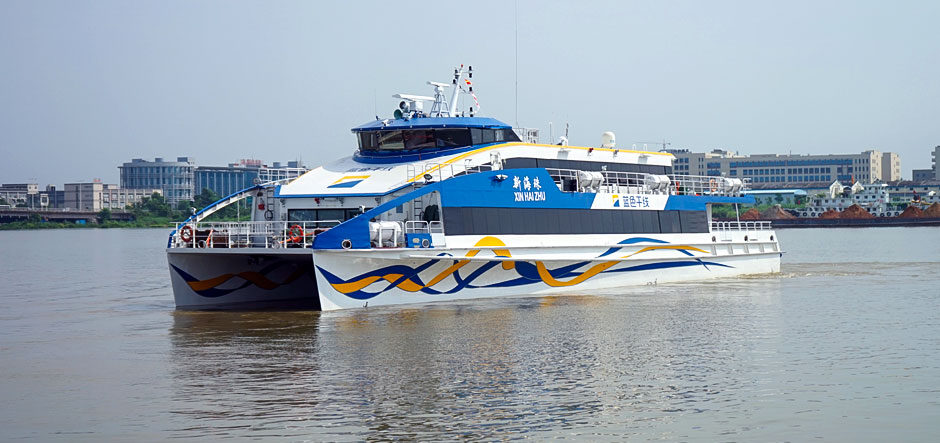 Named Xin Hai Zhu, the high-speed ferry can accommodate 356 passengers and 10 crew members, making it the largest in terms of capacity in the Blue Jet Zhuhai Fast Ferries fleet. Xin Hai Zhu is also the fastest propeller ship in the fleet as it is capable of operating at a speed of 30.7 knots using two propellers connected to two main engines.