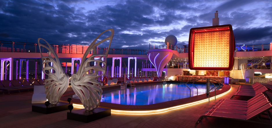Bolideck Future Teak, which was created as an environmentally-friendly alternative to real teak decking, was installed on the moveable Magic Carpet, the main pool area, Mast Grill, Solarium and outdoor deck spa terrace areas on Deck 14. It has also been used around the Sunset Bar and Rooftop Garden on Deck 15, and has been combined with Bolideck Select Hard flooring in the passenger boarding and Destination Getaway areas on Deck 2.