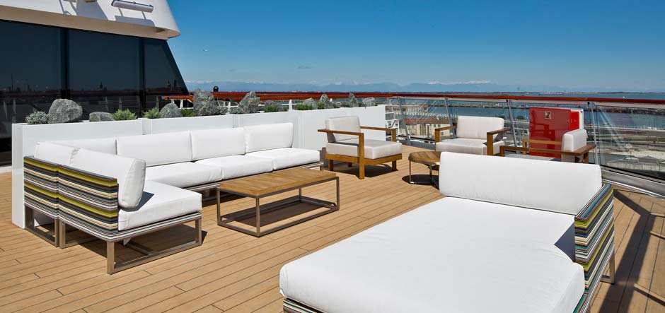 All of the ships will feature slip-resistant Bolidt Future Teak decking systems in most outdoor areas, including the Wintergarden, balconies and terraces. Meanwhile, the sports deck, jogging track and shuffle board areas will have Bolideck Select Soft flooring, and some smaller areas of the outside deck will feature Bolideck Select Hard.