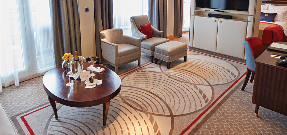 Brintons was appointed by lead design company SMC Design and worked closely with Cunard UK to provide luxurious carpets for various public areas and suites. The carpet designs were inspired by the original Queen Mary, which sailed transatlantic voyages for Cunard between 1936 and 1967.