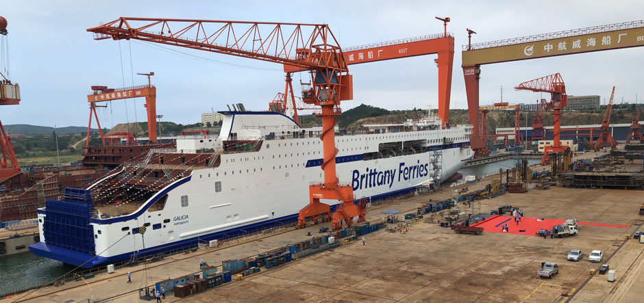 Brittany Ferries has marked two key milestones in its €550 million fleet renewal programme at AVIC Weihai shipyard in China – the float out of new E-Flexer cruise ferry Galicia and the steel cutting for her sister ship Salamanca.