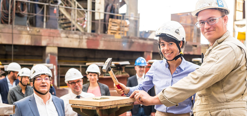 Held to mark a construction milestone and bring good fortune to the ship, the traditional keel-laying and coin ceremony was attended by representatives from Brittany Ferries and FSG. The keel laying is the point when the first hull blocks are lowered onto a slipway, and after they are joined, they will form Honfleur’s complete hull.