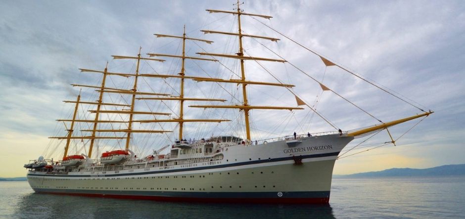 Golden Horizon is 162 metres long and has five masts with 36 cross sails that have a total area of 6,347 square metres. She can accommodate 272 passengers in 140 luxury cabins as well as 159 crew members.