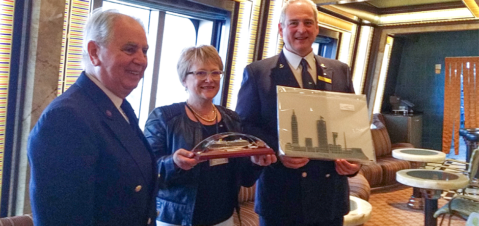 To commemorate the maiden visit, representatives from Le Havre Club Cruise joined Captain Marco Derin onboard the ship for a traditional plaque exchange ceremony.