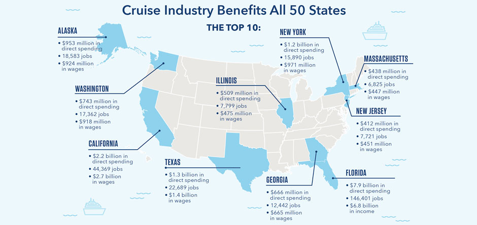 “The global cruise industry is a critical contributor to the US economy and we see evidence of the industry’s positive effect spreading across the country,” said Cindy D’Aoust, CLIA’s acting CEO. “In each of the 50 states, we saw cruise lines purchasing goods or services in support of their operations, and passengers travelling for their cruise vacations. The cruise industry is thriving and making an important economic contribution.”
