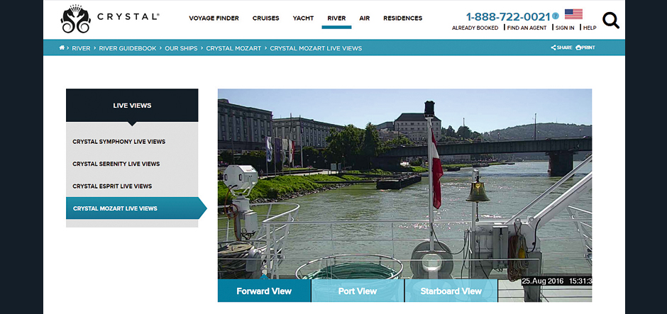 In a river cruise industry first, Crystal River Cruises now offers live-view cameras from three vantage points onboard Crystal Mozart.