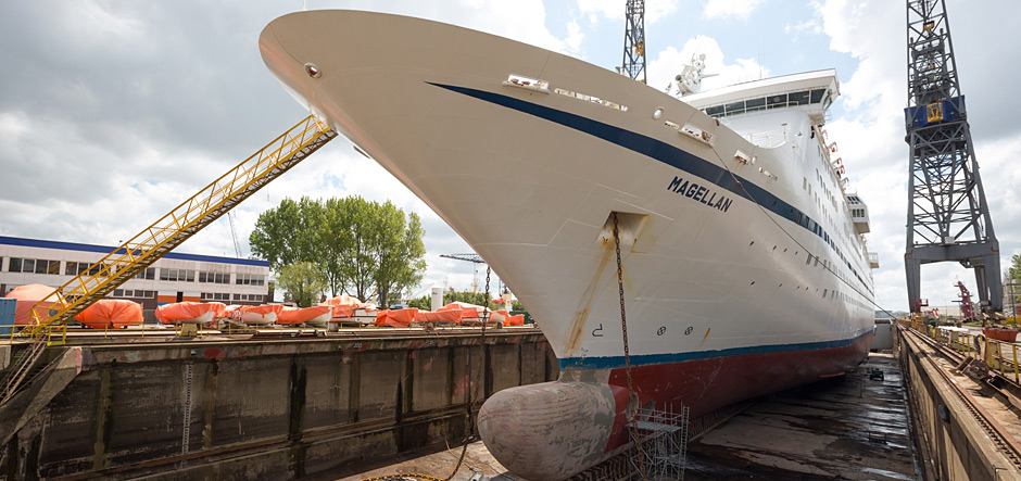 Owned by Global Maritime Group, Magellan recently joined British operator Cruise & Maritime Voyages’ (CMV) fleet and spent two weeks in Damen’s 250m drydock while engineers inspected and cleaned her hull, rudders and propellers.
