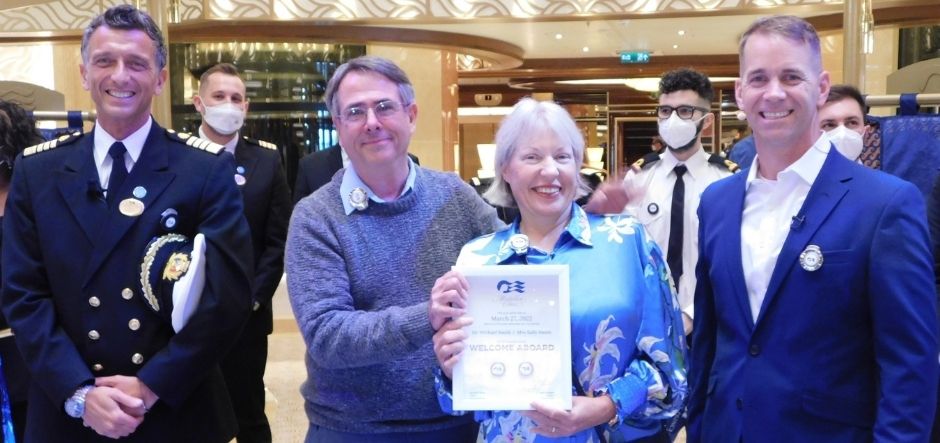 John Padgett, president of Princess Cruises, and Discovery Princess’ officers welcomed the first guests, Michael and Sally Smith, onboard with a ceremony to mark the occasion.