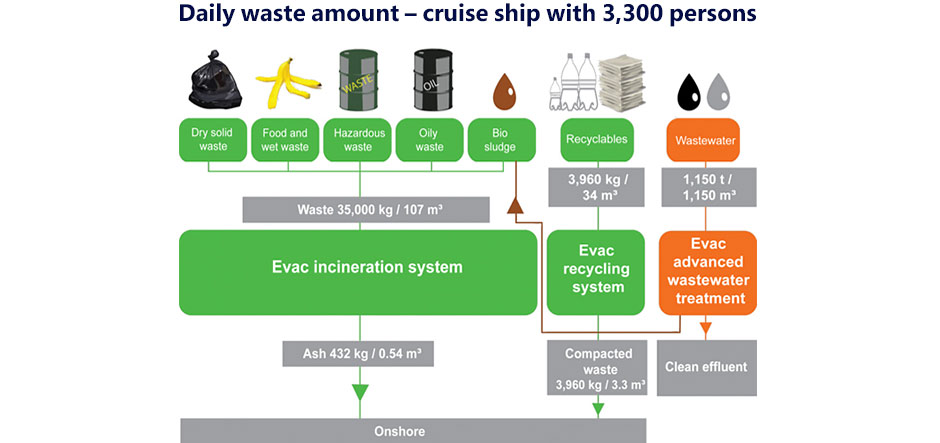 The Evac Complete Cleantech Solution contract also covers dry and wet waste treatment systems for each ship, including an incinerator and recycling equipment for glass, plastic, paper, cardboard and aluminium waste. Evac will also supply food waste vacuum systems, a bio sludge treatment unit, six vacuum units and around 2,300 vacuum toilets per vessel.