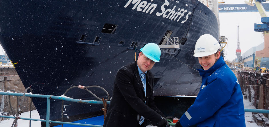 Representatives of Meyer Turku shipyard, TUI Cruises and the media braved temperatures of around -12 Celsius to observe the float-out for the new cruise ship, Mein Schiff 5, on Friday 15 January 2016. The ceremony included the firing of a cannon by a traditionally dressed group, a feature of all ship launches at the Finnish yard.