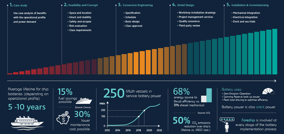 Foreship's infographic also highlights the many potential benefits of using batteries to power vessels. They include up to 15% fuel savings, 30% lower maintenance costs and 50% carbon dioxide emissions reduction over the ship's lifetime compared to traditional marine diesel oil.