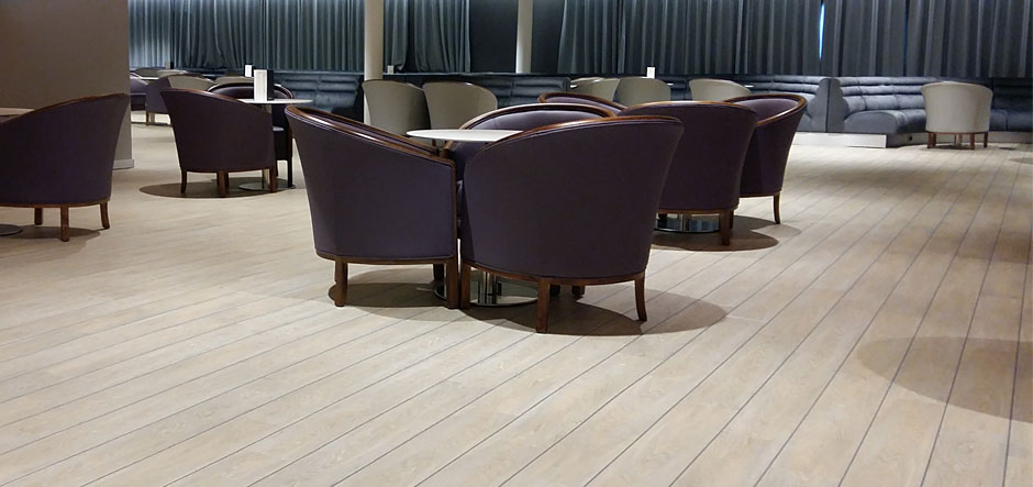 The France-based company provided decorative vinyl flooring from its Streamo Karavel range, which was developed specifically to enhance ship interiors, while meeting the International Maritime Organization safety requirements. For example, the area around the reception desk now boasts both Streamo Karavel Silversands and Mystic River flooring with dark concrete and silver strips. Meanwhile, the restaurant floor has been covered with Karavel Silversands.