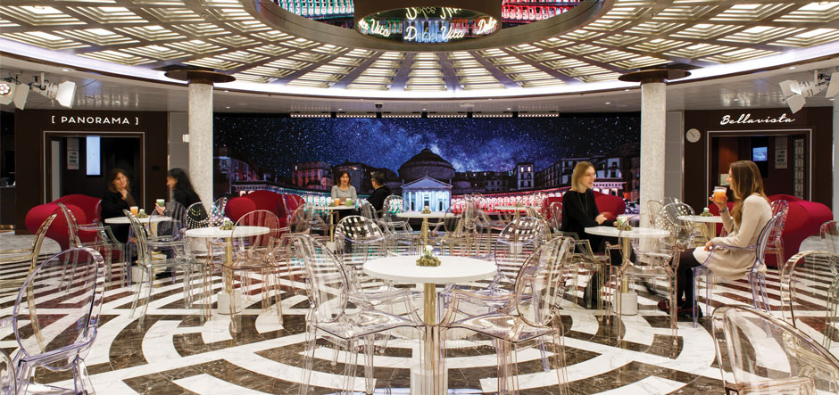 Among the spaces that the team designed was Piazza Trastevere – an onboard hub of activity with bars and restaurants facing onto it – which features an interpretation of Rome’s Pantheon.
