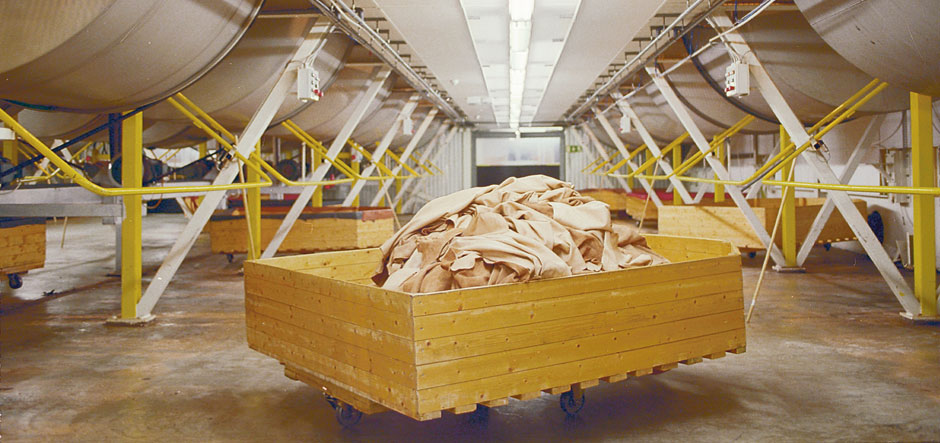 The first step in the process of creating leather is liming, where the hides are cleaned from salt and dehaired. Up to 350 hides are dehaired with water and hair dissolving chemicals together with lime in cylindrical steel drums.