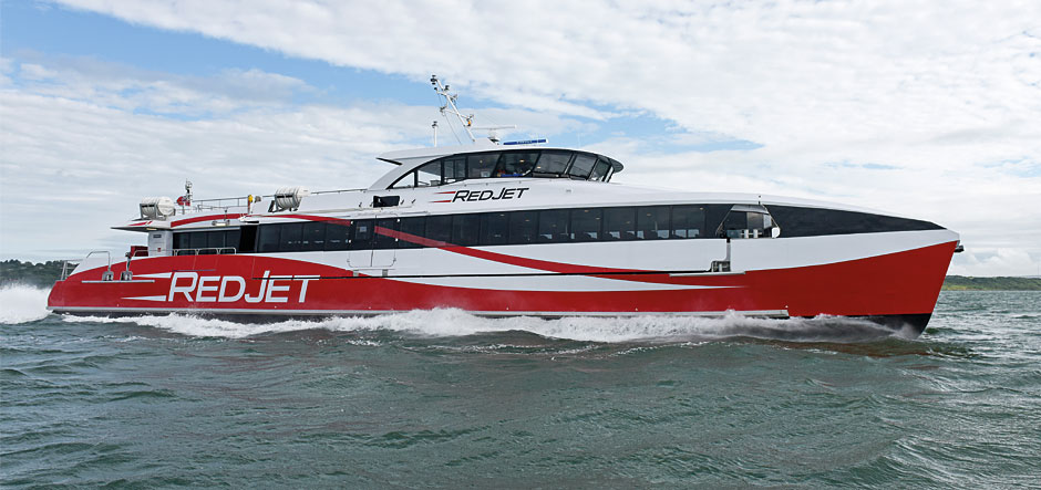 Built with twin hulls, Red Jet 6 is equipped by twin generator sets and four MTU 2000 series engines, which each power a MJP 500 waterjet unit. This configuration helps reduce fuel consumption by 11% compared to Red Jet 4 and 30% compared to Red Jet 5.