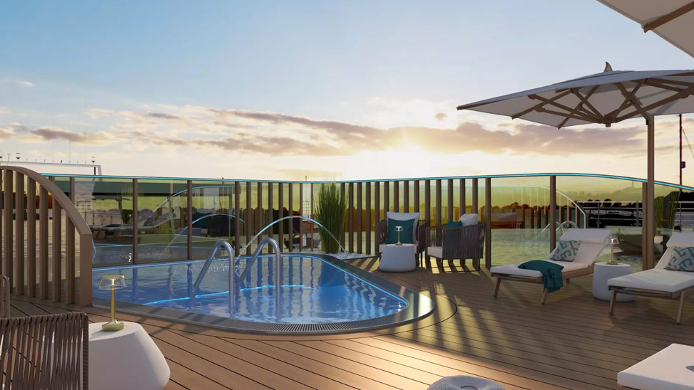 The four-deck ship offers 12 Amadeus Suites, which will feature floor-to-ceiling windows and a walk-out exterior balcony. Inside, each suite includes a corner sofa, a walk-in wardrobe and an ensuite bathroom, as well as a bed that can be configured as either a double or twin.