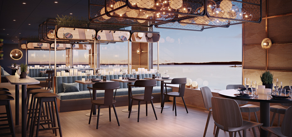 As shown in renderings, Torget’s design encourages guests to enjoy their time onboard at a leisurely pace and take a more reflective view of the world. Viking Line and Koncept Stockholm took a similar approach in the restaurants, where casual dining is heightened by amazing sights across the archipelago.