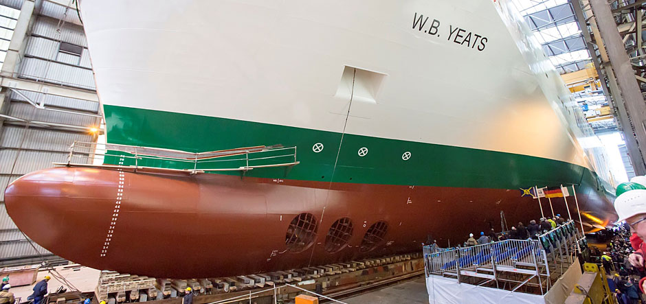 Irish Ferries officially named its new €150 million (US$184 million) cruise ferry W.B. Yeats during the vessel’s float-out ceremony at Flensburger Schiffbau–Gesellschaft (FGS) shipyard in Germany on 19 January.