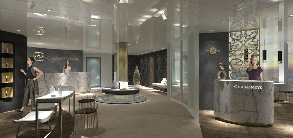 Two of the biggest new features onboard the 13-deck ship will be Indigo, a flagship bar, club and casino, and the first Champneys Spa at sea. Champneys Spa will offer a full-service thermal suite, treatment suites with their own showers and mini saunas, a Finnish sauna with floor-to-ceiling windows, and spa cabanas on the adults-only Veranda Deck. The 1,924-guest ship will also feature 962 cabins, nearly 40% of which will have balconies.