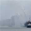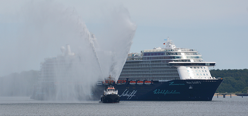 The 99,500gt ship, was escorted through the Kiel Fiord by a Kiel tug displaying a water fountain and berthed at the Ostseekai Cruise Terminal.