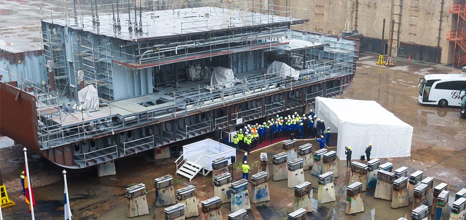 Invited guests and the shipyard’s employees watched as TUI Cruises’ CEO Wybcke Meier and CFO Frank Kuhlmann placed commemorative coins under Mein Schiff 2’s keel. Once the ship is assembled, the coins will be removed and placed onboard to bring good luck to everyone who sails on her.