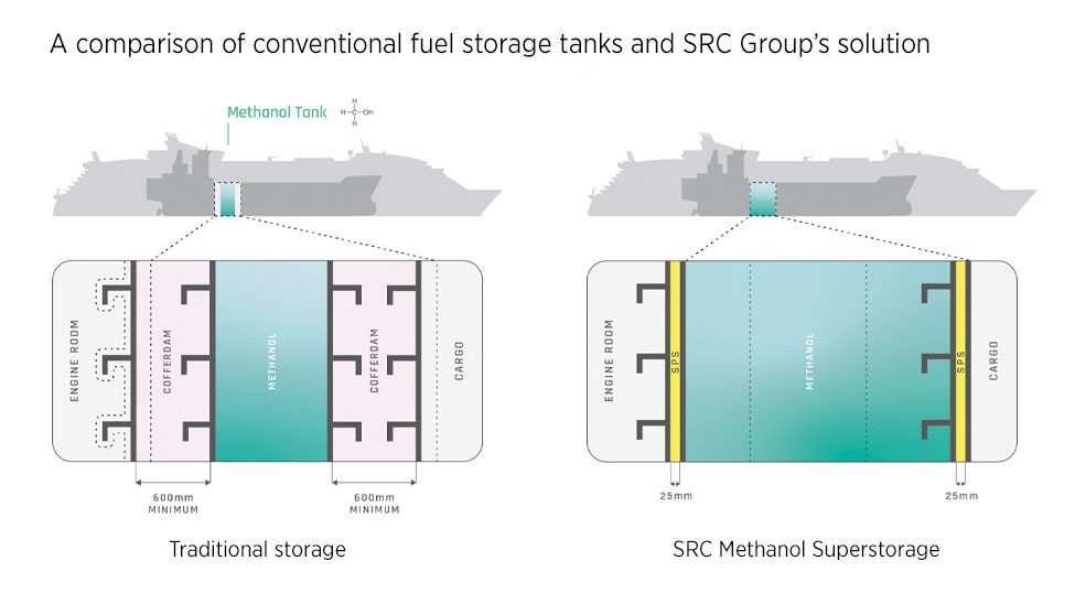 Engineering firm SRC Group’s Methanol Superstorage solution overcomes this challenge by instead using a 25-millimetre-thick steel-polymer-steel ‘sandwich panel system’ to form the tank walls. The solution increases fuel storage volume by 85 per cent and can be installed with minimal impact on the vessel’s general arrangement, making it suitable for newbuilds and retrofit projects.