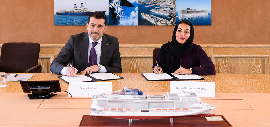 The contract was signed at the cruise line’s headquarters in Geneva, Switzerland by its CEO Gianni Onorato and Noura Rashid Al Dhaheri, director of cruise business for Abu Dhabi Ports.