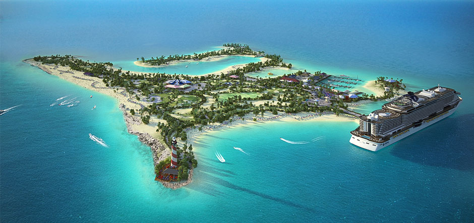 Billed as the biggest island development by any cruise company in the Caribbean, the 95-acre island will be located 32km south of Bimini and 104.5km east of Miami in Florida. It will reflect the culture and natural landscape of the Bahamas by offering more than 80 indigenous Caribbean trees, grasses, flowers and shrubs; a traditional Bahamian village; restaurants and bars offering local specialities; shops; and an arrival centre with island-themed music gazebo.