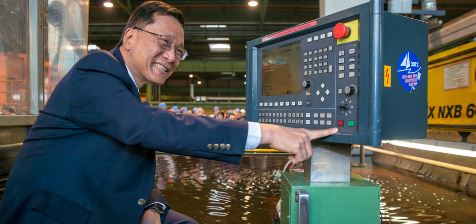 Employees and guests attended the steel-cutting ceremony and watched as the flame cutter was launched by Crystal president and CEO Tom Wolber; Stralsund mayor Alexander Badrow, Mecklenburg-Western Pomerania's Economics Minister Harry Glawe; and Tan Sri Lim Kok Thay, chairman and CEO of Genting Hong Kong, which owns both Crystal and MV Werften.