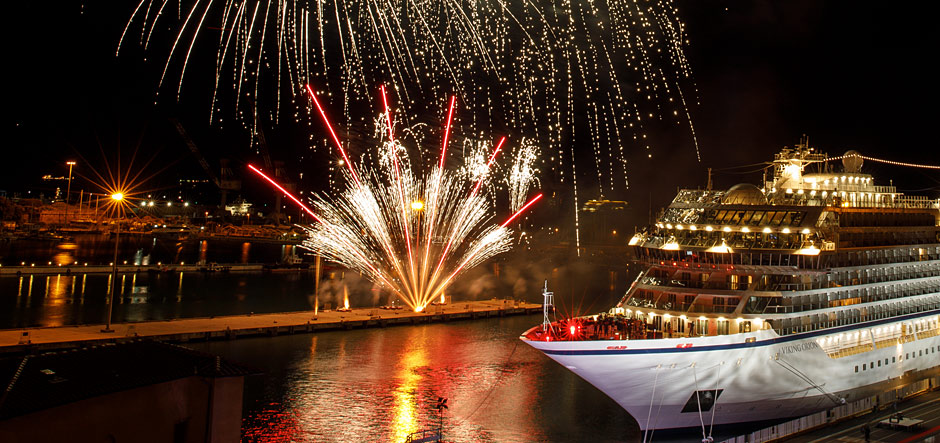 During the naming ceremony, Fisher offered a blessing of good fortune and safe sailing for Viking Orion and used an historic Viking broad axe to cut a ribbon that allowed a bottle of Norwegian aquavit to break on the ship’s hull. Guests were then treated to a high-tech show and musical concert that celebrated Nordic mythology.
