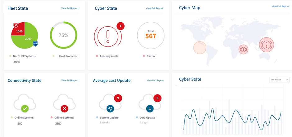 Once the endpoint system has gathered information from navigation and machinery equipment, the data is accessed via the dashboard display on a PC. The dashboard provides information on the status of critical equipment, allowing crew and onshore personnel to quickly determine the number of PC-based systems onboard each ship and which of them are protected.