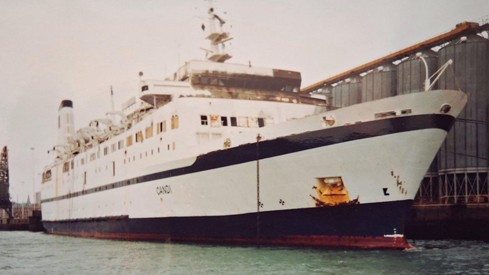 When I was a young surveyor for Lloyd’s Register in the early 1990s there was a ro-ro passenger ferry moored across the quayside in Southampton, UK, named ‘Candi’. It never moved while I worked there, but I’d look out of the window of our office on Town Quay and wonder what it must have been like on that vessel when she sailed as the Scandinavian Star.