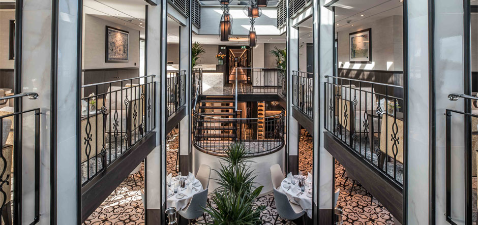 Many of the ship’s interiors will be decorated with traditional painted ceramic tiles, known as azulejos, which gained widespread popularity in Portugal during the 1500s. The tiles will be visible in the main Compass Rose restaurant, the al fresco Arthur’s dining venue, the cabins and in a hand-painted mosaic map depicting the Iberian Peninsula and surrounding oceans in the reception area. Similarly, the carpets, railings and ceiling lamps in the atrium all reflect the curving patterns of azulejo designs.
