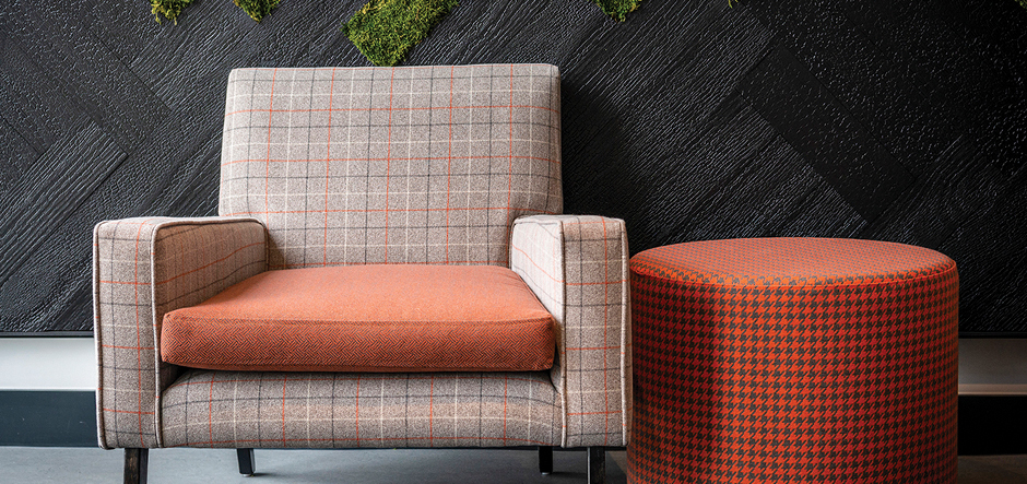 4. Skopos Fabrics’ Herriot collection is inspired by wool and features a natural texture, a waterproof layer, antimicrobial protection, and is soil resistant. Herriot has been developed using new back-coating technology to minimise the use of chemicals while providing flame retardance. The fabric is available in four designs, including a large-scale hearthside check, a contemporary tailored diamond, a two-tone basket weave and a bold dogtooth, which can be produced in a mix of neutral and bright tones.