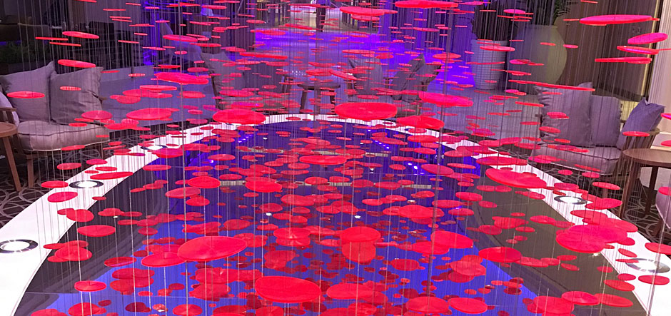 In the rotunda, which connects Jamie’s Italian and Vintages mid-ship, is ‘Lure’ by Chinese artist Bieli Liu. Adapted from a series of ‘Lure’ installations, the sculpture was inspired by the natural movement of the ship and represents an ancient Chinese legend depicting the red threads that connect Chinese children to their soulmates. The installation is suspended from the ceiling to enable it to respond to air currents and movement.