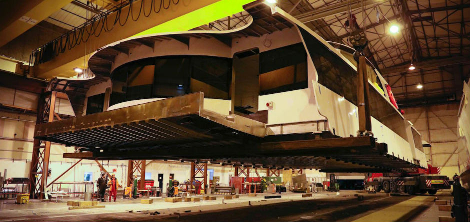 Engineers have completed and received certification for the majority of the structural aluminium work on the twin hulls and the accommodation section, and fitted four MTU 2000 series engines and twin generator sets in the hulls. Various pieces of ancillary equipment have also been mounted in position in the engine room.