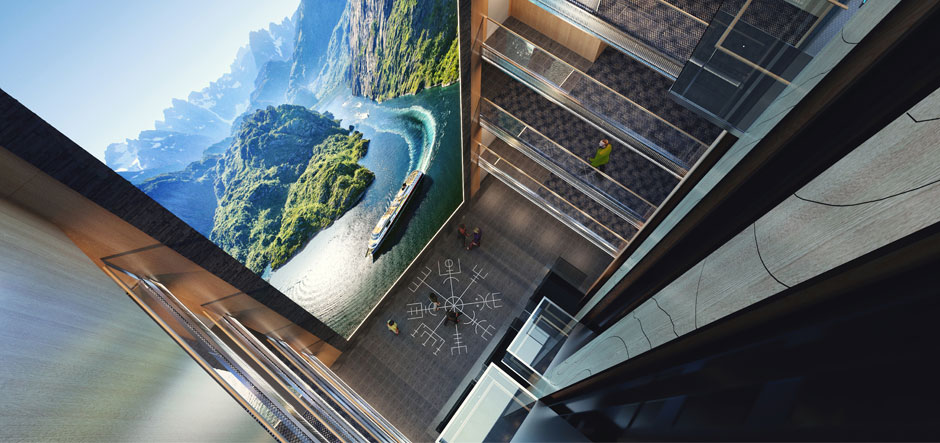 The screen’s efforts to display the surrounding scenery will be also be reflected in Roald Amundsen’s Scandinavian design, including the Amundsen Science Center, observation decks, infinity pool, panoramic sauna and aft-facing suites with private outdoor hot tubs.