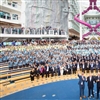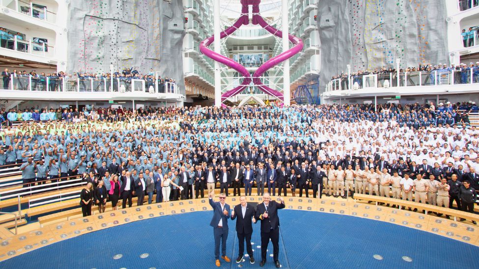 The official handover ceremony took place at the shipbuilding yard in Saint-Nazaire, France, and was attended by Jason Liberty, president and CEO of Royal Caribbean Group; Michael Bayley, president and CEO of Royal Caribbean International; and Laurent Castaing, general manager of Chantiers de l’Atlantique. They were joined by more than 1,600 crew members and ship workers in the ship’s AquaTheater for the first onboard party (pictured above).
