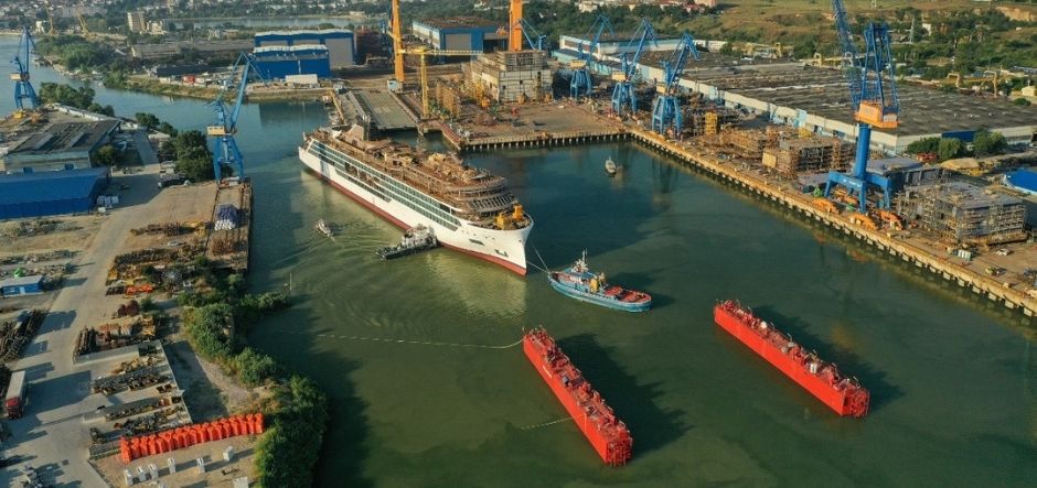 The ship will now be moved to a nearby outfitting dock for further construction and interior build-out.