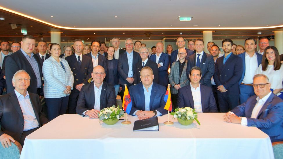 Attendees at the onboard handover included Jason Liberty, Royal Caribbean Group’s president and CEO; Bert Hernandez, president of Silversea; Bernard Meyer, chairman of the Meyer Group; and Bernd Eikens, Meyer Group CEO. They participated in several maritime traditions, including signing ceremonies, speeches and a celebratory toast.