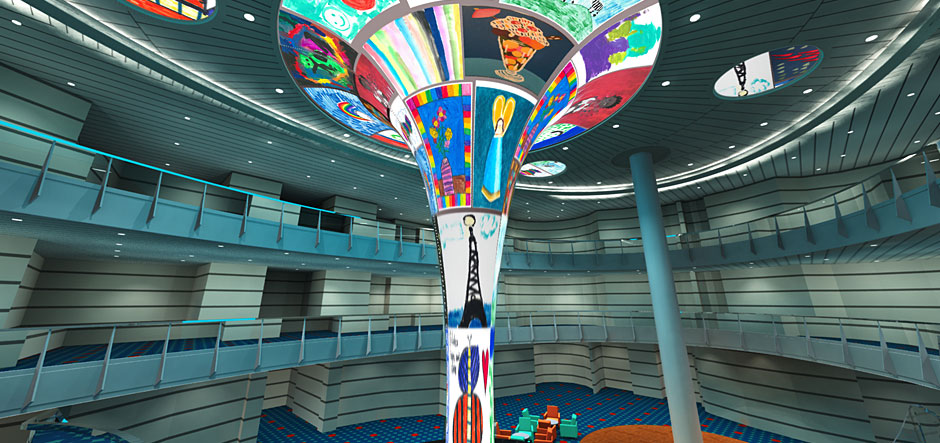 Designed by Techno Media, Dreamscape is a 24-foot (three-deck high) funnel-shaped centrepiece comprising more than 2,000 flexible LED tiles that have been customised for the shipboard environment. The 33 creations from St. Jude’s young patients will complement the more than 100 images that continually rotate throughout the day and evening, according to the time of day, port or occasion.