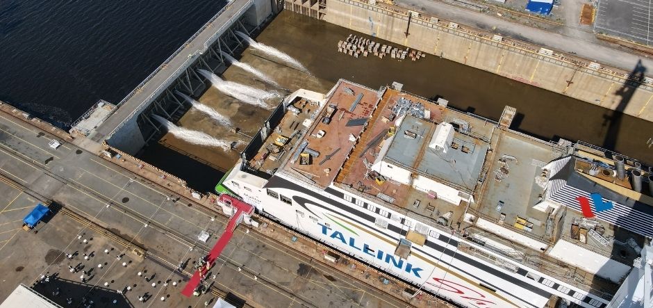 The LNG-powered ferry was officially named by godmother and president of Estonia Kersti Kaljulaid, with a limited number of guests at the shipyard and other viewers able to join the event via live stream. The ship was then launched as sea water was let into the drydock for the first time.