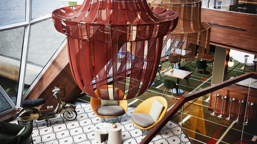 The design includes several new venues, including a redesigned two-deck atrium. Previously featuring an interior inspired by the entertainment district in Hamburg, Germany, the space has now been transformed into an Italian piazza by TDoS.