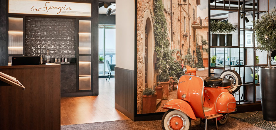 Over 40 items of bespoke joinery were custom made and installed onboard, including a wine chiller cabinet and booth seating. Trimline also sourced a working Vespa for La Spezia, which was then decommissioned and refurbished before being installed in the restaurant.