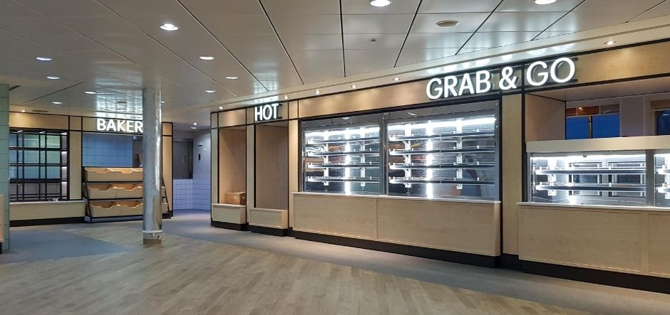 During the three-week refit project, Trimline’s team of joiners, catering specialists, floor layers and labourers replaced all hot and cold serveries in the Club Lounge and Food Market with self-service and ‘Grab & Go’ areas. To ensure the team’s safety during the pandemic, their temperature was taken twice per shift and face masks were worn throughout.