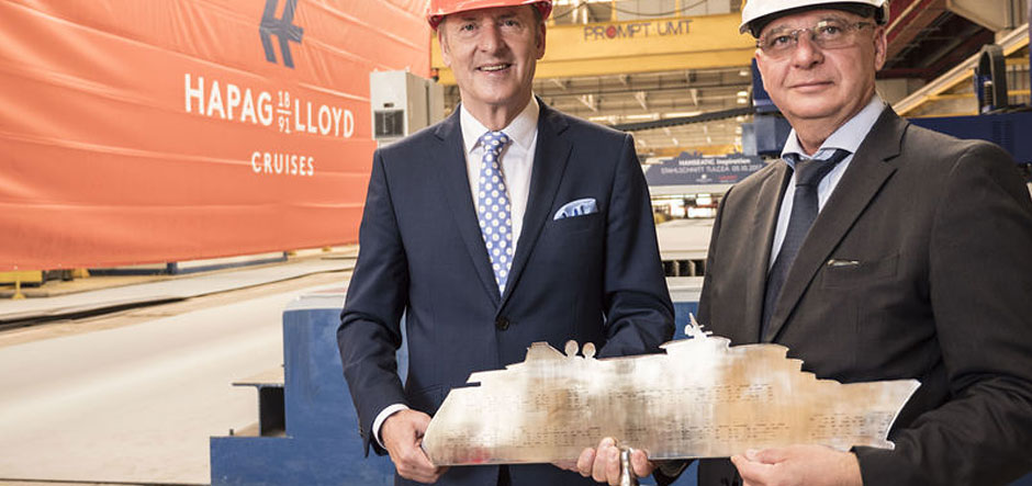 Karl J. Pojer, the cruise line’s CEO, officially started the steel-cutting process, marking the start of Hanseatic Inspiration’s construction. During the official ceremony, Vard’s senior vice president and yard director Tudorel Topa presented Hapag-Lloyd Cruises’ management team with a steel silhouette of the Hanseatic Inspiration.